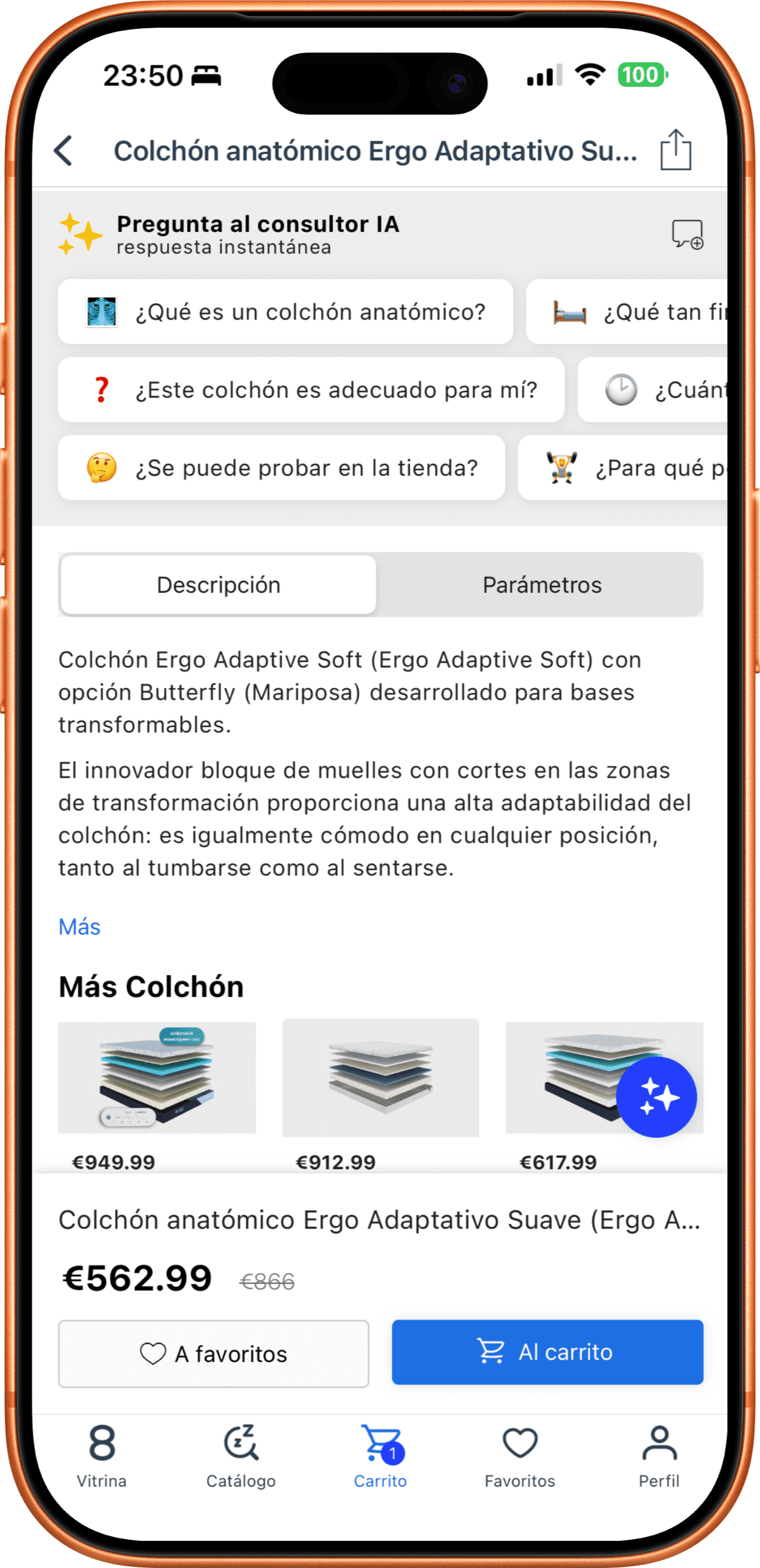 Ayuda a elegir productos, responde preguntas y se conecta con el cliente en el momento adecuado — desde la ficha del producto hasta el soporte.